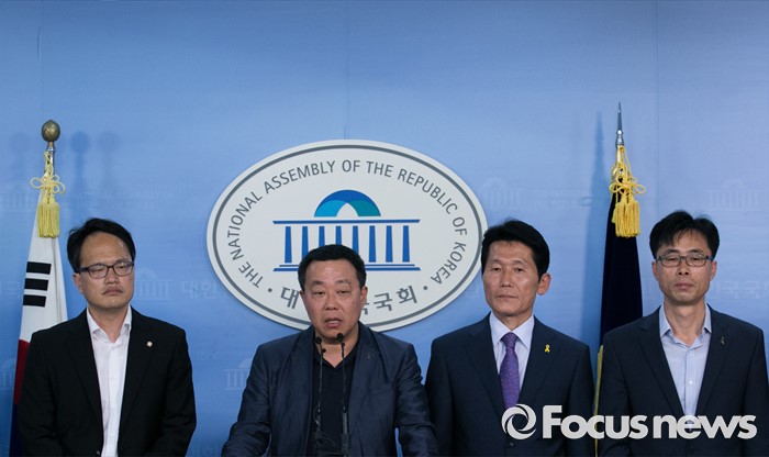 (서울=포커스뉴스) 박주민(왼쪽 첫번째) 더불어민주당 의원과 윤소하(오른쪽 두번째) 정의당 의원, 전명선(오른쪽 첫번째) 4·16가족협의회 운영위원장, 유경근 집행위원장 등이 7일 오후 서울 여의도 국회 정론관에서 세월호 특별법 개정안 발의 기자회견을 하고 있다.