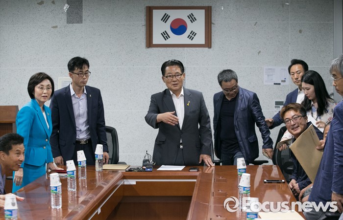 (서울=포커스뉴스) 박지원 국민의당 원내대표가 7일 오후 서울 여의도 국회 의원회관에서 세월호 특별법 개정안과 관련 전명선 4·16가족협의회 운영위원장, 유경근 집행위원장 등 관계자들과 면담에 앞서 안내하고 있다.
