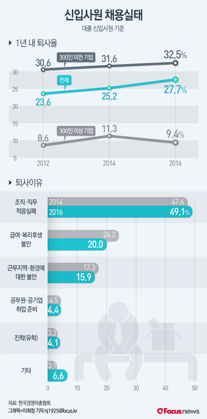 (서울=포커스뉴스) 한국경영자총협회가 전국 306개 기업을 대상으로 '2016년 신입사원 채용실태 조사'를 실시한 결과, 대졸 신입사원의 1년 내 퇴사율은 27.7%로, 2014년 대비 2.5%p 증가했다.
