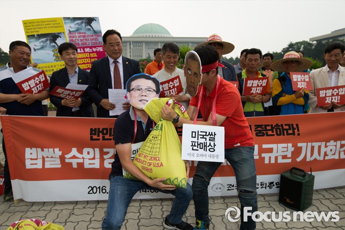 (서울=포커스뉴스) 7일 오후 서울 여의도 국회 정문 앞에서 열린 밥쌀 수입 강행하는 박근혜 정부 규탄 기자회견에서 전국농민회총연맹 회원들이 퍼포먼스를 하고 있다.