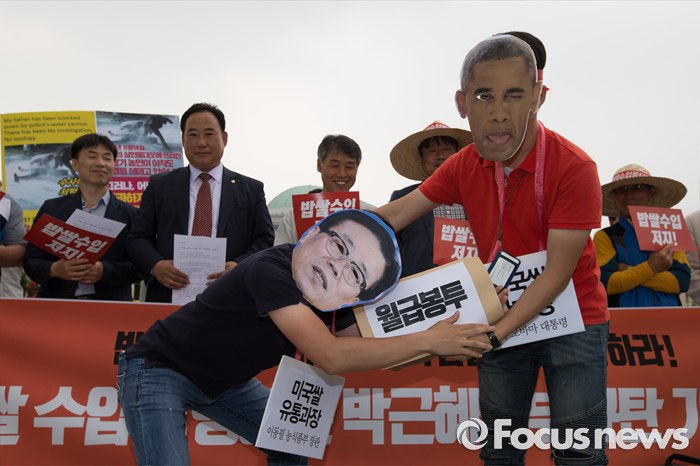(서울=포커스뉴스) 7일 오후 서울 여의도 국회 정문 앞에서 열린 밥쌀 수입 강행하는 박근혜 정부 규탄 기자회견에서 전국농민회총연맹 회원들이 퍼포먼스를 하고 있다.