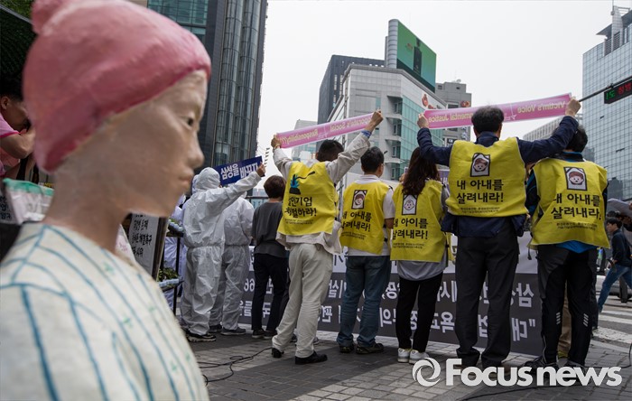 (서울=포커스뉴스) 7일 오후 서울 서초구 삼성전자 사옥 앞에서 열린 '반도체 공장 희생자들과 가습기살균제 피해자들 연대 기자회견'에서 가피모 및 반올림 회원들이 정부 및 기업의 책임을 촉구하는 구호를 외치고 있다.
