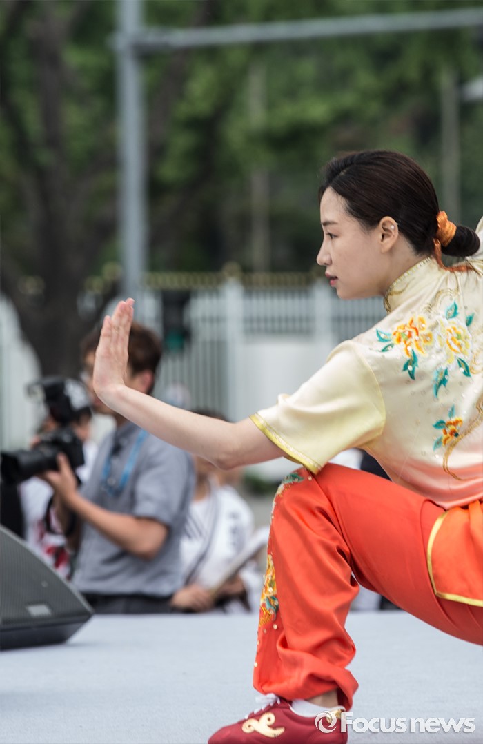 (서울=포커스뉴스) 7일 오후 서울 종로구 광화문 광장에서 열린 '2016 청주(충북) 세계무예마스터십 D-100성공기원행사'에 참여한 시범단이 우슈 동작을 선보이고 있다.