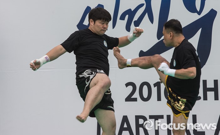 (서울=포커스뉴스) 7일 오후 서울 종로구 광화문 광장에서 열린 '2016 청주(충북) 세계무예마스터십 D-100성공기원행사'에 참여한 시범단이 무에타이를 선보이고 있다.