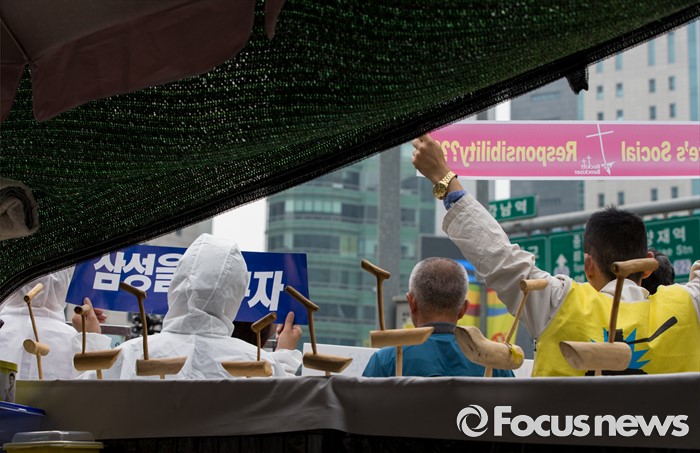 (서울=포커스뉴스) 7일 오후 서울 서초구 삼성전자 사옥 앞에서 열린 '반도체 공장 희생자들과 가습기살균제 피해자들 연대 기자회견'에서 가피모 및 반올림 회원들이 정부 및 기업의 책임을 촉구하는 구호를 외치고 있다.