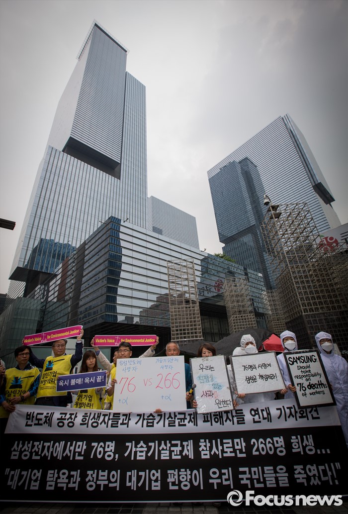 (서울=포커스뉴스) 7일 오후 서울 서초구 삼성전자 사옥 앞에서 열린 '반도체 공장 희생자들과 가습기살균제 피해자들 연대 기자회견'에서 가피모 및 반올림 회원들이 정부 및 기업의 책임을 촉구하는 구호를 외치고 있다.