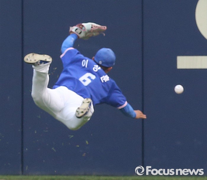 (서울=포커스뉴스) 7일 서울 잠실구장에서 열린 2016 프로야구 삼성-LG 경기 1회말 2사후 삼성 우익수 이상훈이 LG 이병규의 외야 뜬공 타구를 잡으려 몸을 날렸으나 놓치고 있다.