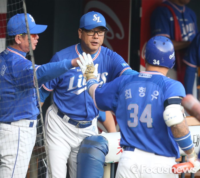 (서울=포커스뉴스) 8일 서울 잠실구장에서 열린 2016 프로야구 삼성-LG 경기 2회초 삼성 선두타자 최형우가 우월 솔로 홈런을 치고 류중일 감독과 하이파이브하고 있다.