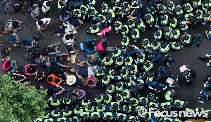(서울=포커스뉴스) 사내하청 전원 정규직화를 요구하며 고공농성을 벌여온 기아자동차 사내하청 노동자 최정명씨와 한규협씨가 농성을 해제한 8일 오후 서울 중구 옛 국가인권위원회 건물 옥상 광고탑 농성장에서 내려와 병원으로 이동하던 중 경찰과 노조원들이 실랑이를 벌이고 있다.