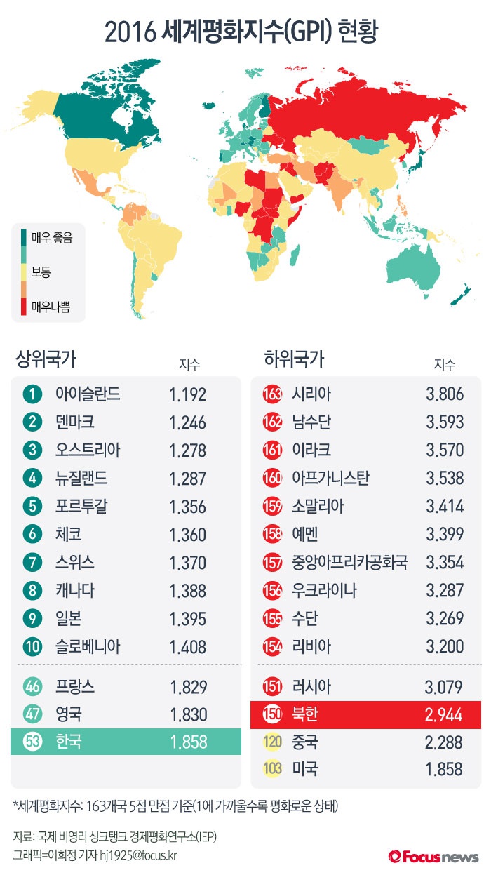 (서울=포커스뉴스)8일(현지시간) 외신보도에 따르면 국제 비영리 싱크탱크 경제평화연구소(IEP)가 발표한 2016년 세계평화지수(GPI)는 각국에서 발생한 테러와 정치 불안으로 인해 하락했다. 한국은 평화지수 1.858로 지난해 42위에서 11계단 하락한 53위를 차지했다. 북한은 평화지수 2.944를 기록하며 전체 163개국 중 150위로 최하위 그룹에 속했다.