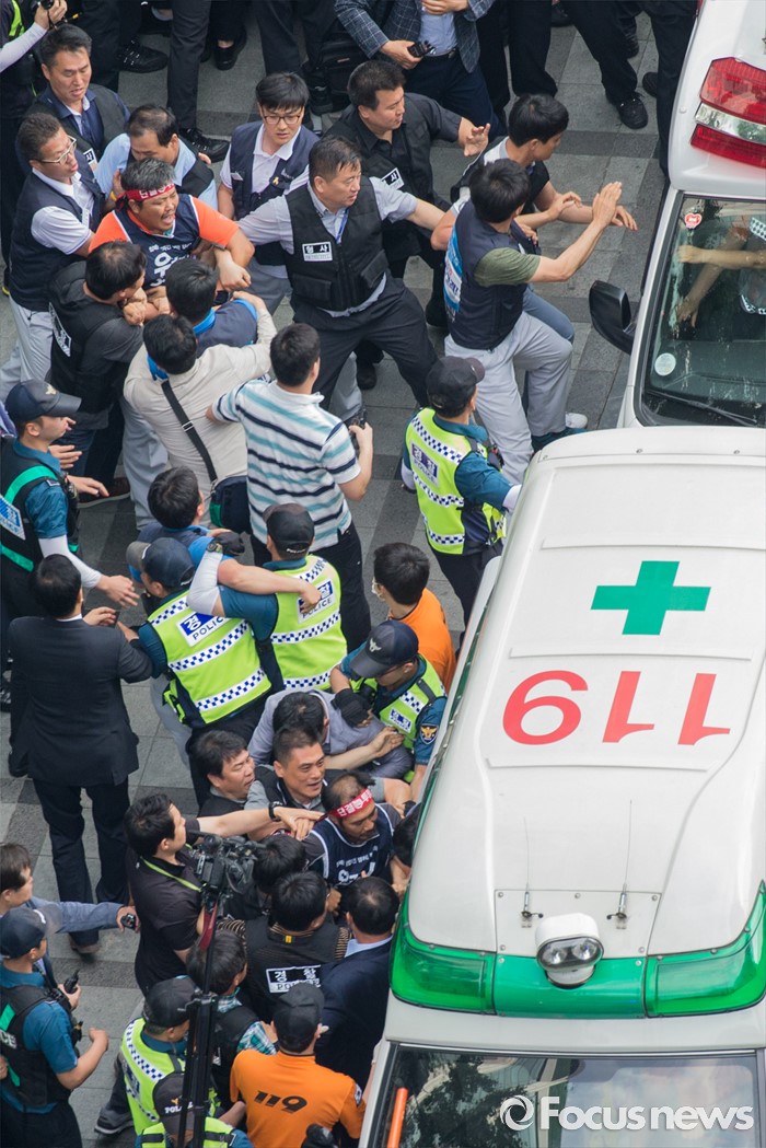 (서울=포커스뉴스) 8일 오후 서울 을지로 옛 국가인권위원회 옥상 광고탑에서 기아자동차 비정규직 노동자의 정규직화를 요구하며 363일 동안 고공농성을 벌인 한규협(위쪽)씨와 최정명씨가 경찰에 의해 구급차로 끌려가고 있다.