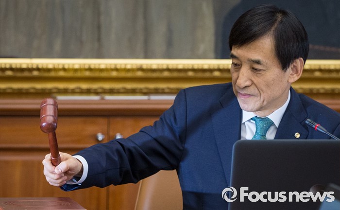 (서울=포커스뉴스) 9일 오전 서울 중구 남대문로 한국은행 본관에서 열린 금융통화위원회 본회의에 참석한 이주열 한국은행 총재가 개회를 알리는 의사봉을 두드리고 있다.