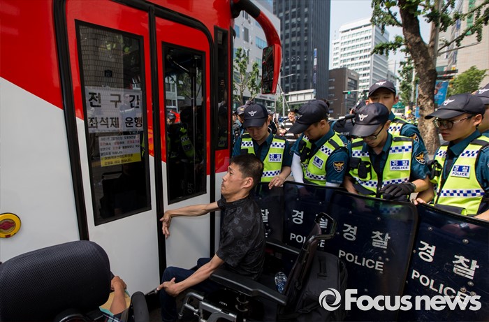 (서울=포커스뉴스) 9일 오전 서울시청 서소문별관 인근의 버스정류장에서 장애인차별철폐연대 회원들이 장애인 이동권 보장을 촉구하며 경기도행 광역버스 기습 점거시위를 벌여 경찰과 충돌하고 있다.