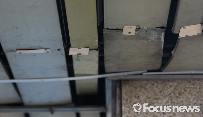 (서울=포커스뉴스) 9일 오전 서울 지하철 종로5가역 지하상가와 출입구를 연결하는 통로의 천장이 훼손돼 임시방편으로 철제 구조물로 조치 되어 있다. 플라스틱 소재로 마감된 천장은 움푹 패어있었으며 휘어지거나 깨진 곳도 많아 위태로워 보인다.