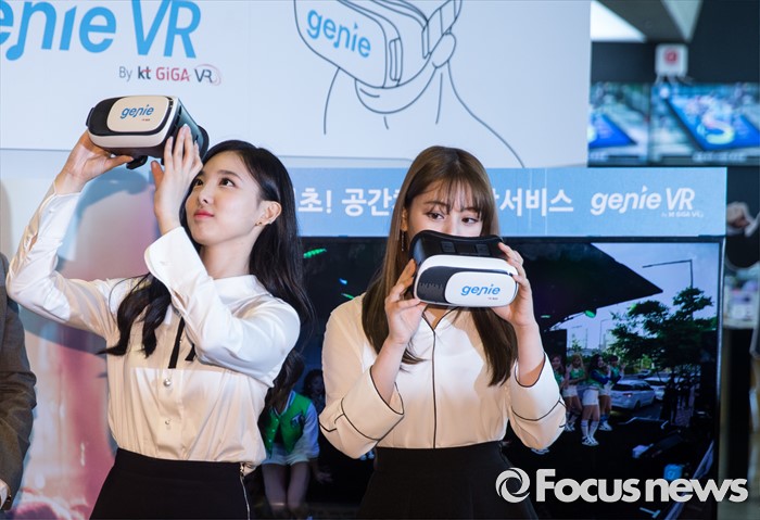 (서울=포커스뉴스) 9일 오전 서울 종로구KT스퀘어에서 열린 KT뮤직 VR서비스 론칭 기자간담회에 참여한 걸그룹 트와이스의 멤버 나연(왼쪽)과 지효가 관련 서비스를 체험하고 있다.