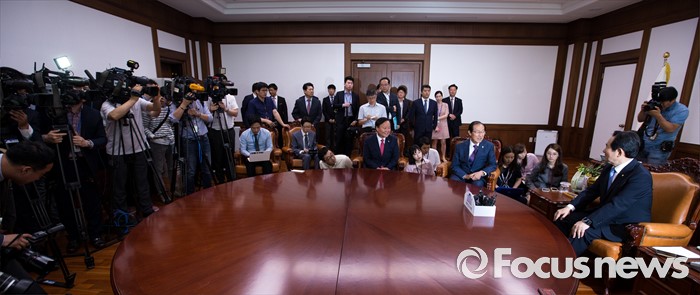 (서울=포커스뉴스) 정세균(오른쪽) 국회의장이 10일 오전 서울 여의도 국회에서 이원종(가운데) 대통령비서실장, 김재원 청와대 정무수석과 면담 하고 있다.
