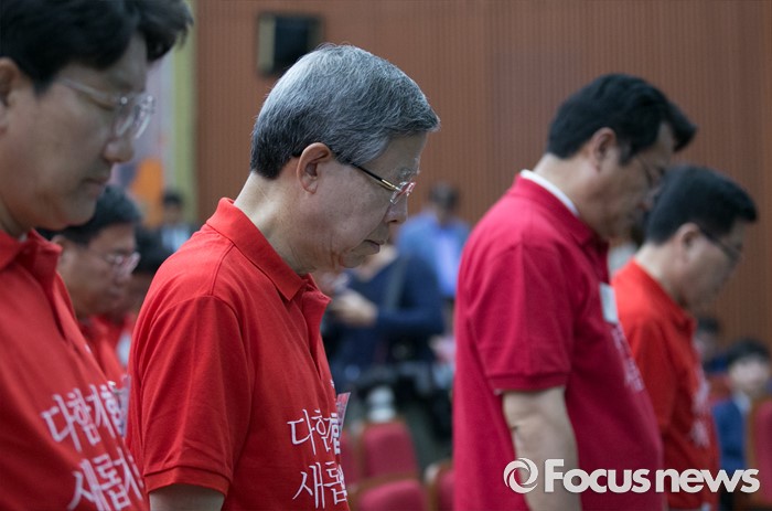 (과천=포커스뉴스) 10일 오전 경기도 과천 국가공무원인재개발원에서 열린 2016 새누리당 정책워크숍에 참석한 권성동(왼쪽부터) 사무총장, 김희옥 혁신비대위원장, 정진석 원내대표, 김광림 정책위의장 등 의원들이 묵념을 하고 있다.
