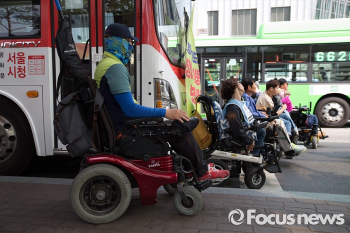 (서울=포커스뉴스) 8일 오후 서울 영등포구 여의도 환승센터 앞에서 경기장애인차별철폐공동투쟁단원들이 장애인 이동권 보장을 촉구하며 경기도행 버스를 막아서고 구호를 외치고 있다.