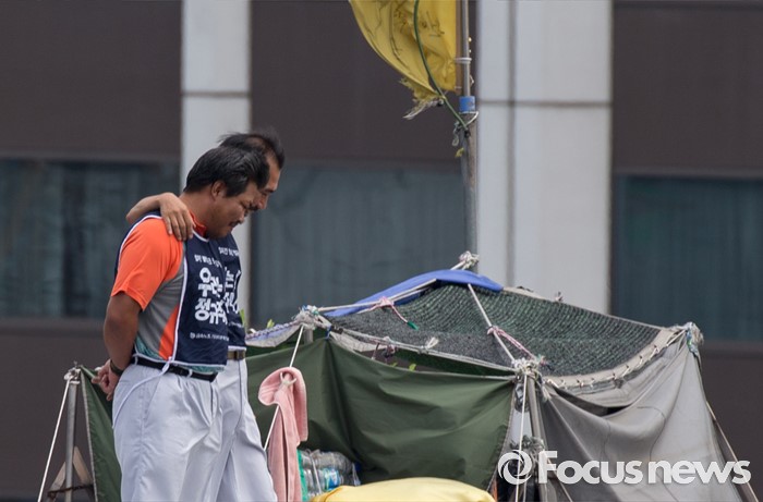 (서울=포커스뉴스) 8일 오후 서울 을지로 옛 국가인권위원회 옥상 광고탑에서 기아자동차 비정규직 노동자의 정규직화를 요구하며 363일 동안 고공농성을 벌인 한규협(왼쪽)씨와 최정명씨가 지상을 바라보고 있다.