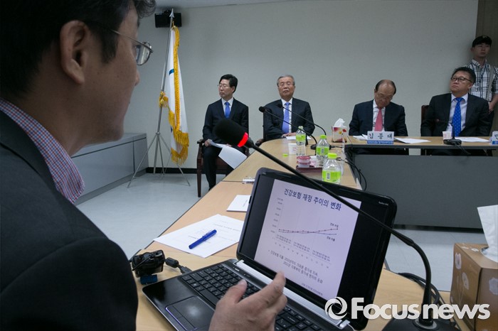 (서울=포커스뉴스) 8일 오전 서울 여의도 민주정책연구원에서 '건강보험 부과체계 개편 방안' 주제로 열린 사회경제포럼에 참석한 양승조(왼쪽부터) 더불어민주당 의원, 김종인 비대위 대표, 김종대 정책위부의장, 민병두 민주정책연구원장이 이진석 서울대 의대 교수의 발제를 듣고 있다.