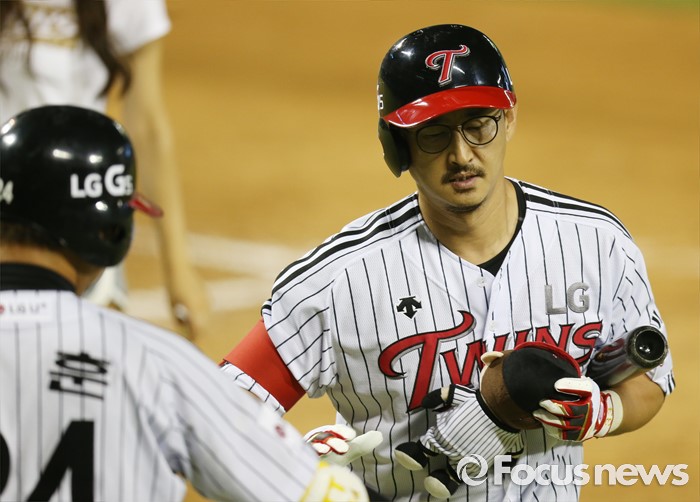 (서울=포커스뉴스) 8일 서울 잠실구장에서 열린 2016 프로야구 삼성-LG 경기 7회말 LG 박용택이 선두타자로 나와 우월 솔로 홈런을 치고 임훈의 환영을 받으며 홈인하고 있다.