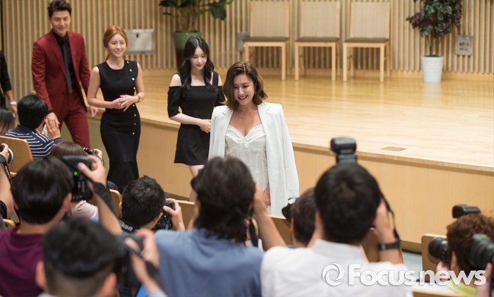 (서울=포커스뉴스) 8일 오후 서울 양천구 SBS 목동사옥에서 열린 SBS 일일드라마 '당신은 선물' 제작발표회에 참석한 배우 최명길(오른쪽부터), 허이재, 진예솔, 송재희가 이동하고 있다.