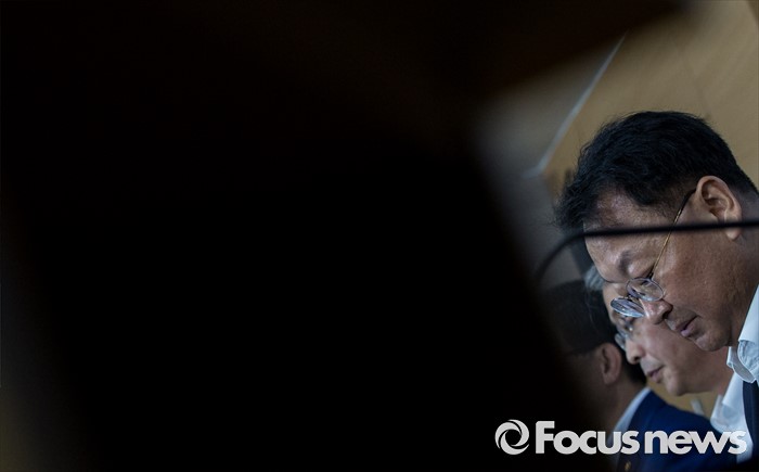 (서울=포커스뉴스) 8일 오전 서울 종로구 정부서울청사에서 유일호 부총리 겸 기획재정부 장관이 구조조정 추진현황 및 계획에 대해 발표 도중 생각에 잠겨 있다.