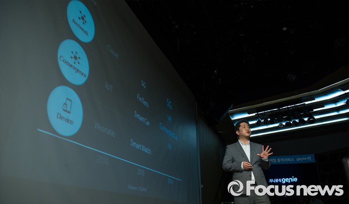 (서울=포커스뉴스) 9일 오전 서울 종로구KT스퀘어에서 열린 KT뮤직 VR서비스 론칭 기자간담회에 참석한 김성욱 KT뮤직 대표가 서비스 관련 발표를 하고 있다.