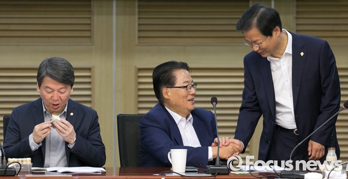 (서울=포커스뉴스) 8일 오전 서울 여의도 국회 의원회관에서 열린 국민의당 12차 정책역량강화 워크숍에 참석한 천정배(오른쪽) 공동대표와 박지원(가운데) 원내대표가 인사하고 있다. 왼쪽은 안철수 상임공동대표.