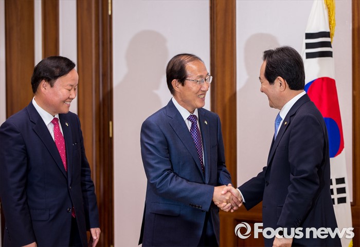 (서울=포커스뉴스) 정세균(오른쪽) 국회의장이 10일 오전 서울 여의도 국회에서 이원종(가운데) 대통령비서실장, 김재원 청와대 정무수석과 면담에 앞서 악수 하고 있다.