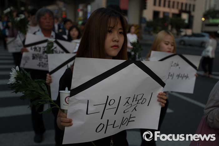 (서울=포커스뉴스) 지난달 28일 서울 지하철 2호선 구의역에서 스크린도어 정비 도중 숨진 김 모씨의 발인을 하루 앞둔 8일 오후 서울 광진구 지하철 2호선 구의역 인근에서 시민들이 김 모씨를 추모하며 행진하고 있다.