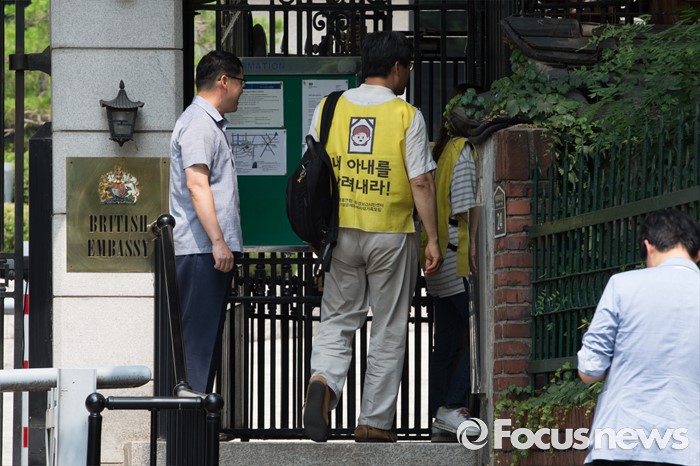 (서울=포커스뉴스) 10일 오전 서울 중구 주한영국대사관으로 가습기살균제 피해 가족과 환경보건시민센터 시민 단체 관계자들이 영국대사와의 면담을 위해 들어가고 있다.