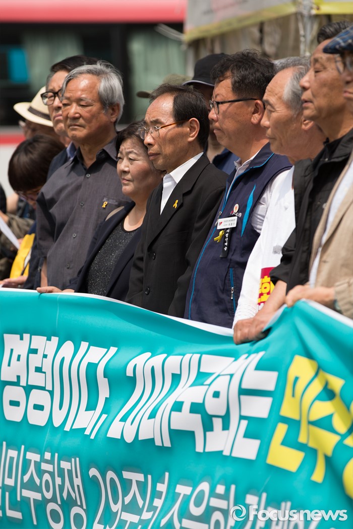 (서울=포커스뉴스) 10일 오전 서울 종로구 광화문 광장에서 민주주의국민행동 단체 회원들이 6.10 민주항생 29주년 관련 기자회견을 하고 있다.