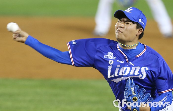 (서울=포커스뉴스) 7일 서울 잠실구장에서 열린 2016 프로야구 삼성-LG 경기에서 9회 등판한 삼성 투수 심창민이 혼신의 힘을 다해 투구하고 있다.