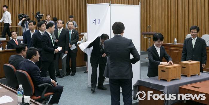 (서울=포커스뉴스) 9일 오전 서울 여의도 국회에서 국회 부의장 후보 선출을 위해 열린 국민의당 의원총회에 참석한 의원들이 투표를 하고 있다. 이날 국민의당은 국회 부의장 후보로 박주선 의원을 선출했다.