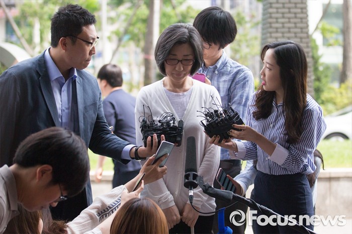(서울=포커스뉴스) 미공개 정보를 이용해 주가하락 손실을 피한 혐의를 받고 있는 최은영 전 한진해운 회장이 피의자 신분으로 8일 오전 서울 양천구 서울남부지검에 들어서며 취재진 질문을 받고 있다.