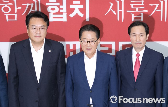 (서울=포커스뉴스) 8일 오후 서울 여의도 국회 새누리당 원내대표실에서 진행된 20대 국회 원구성 협상 등을 위한 3당 원내지도부 회동에 참석한 의원들이 포즈를 취하고 있다. 왼쪽부터 정진석 새누리당 원내대표, 박지원 국민의당 원내대표, 우상호 더불어민주당 원내대표.
