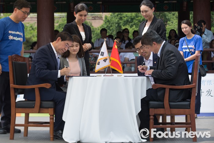 (서울=포커스뉴스) 박원순(왼쪽) 서울시장과 쉐샤오깡 중국여행사총사유한공사(CTS) 총재가 9일 오후 서울 중구 남산 한옥마을에서 한-중 관광산업 상생발전을 위한 업무협약을 체결하고 있다.