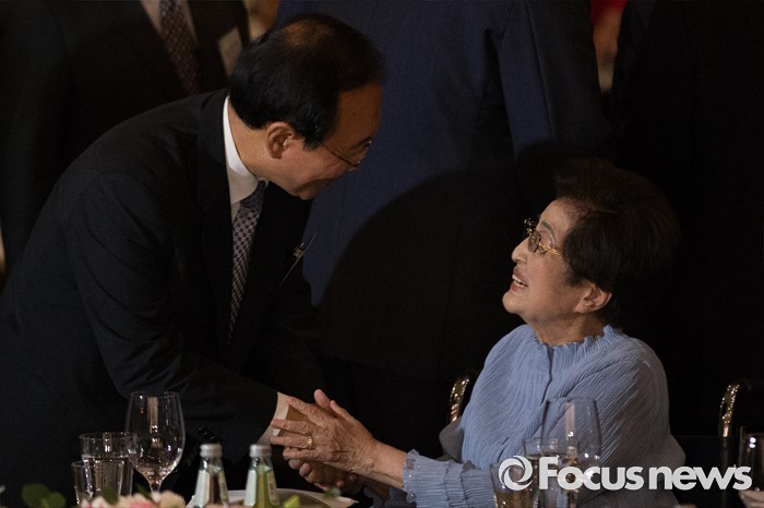 (서울=포커스뉴스) 9일 오후 서울 여의도구 63빌딩 그랜드볼룸에서 열린 '6.15 남북정상회담 16주년 기념식'에 참석한 노회찬 정의당 원내대표(왼쪽)가 이희호 여사와 악수하고 있다.