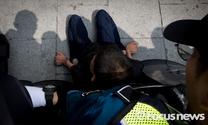 (서울=포커스뉴스) 9일 오전 서울시청 서소문별관 인근의 버스정류장에서 장애인차별철폐연대 회원들이 장애인 이동권 보장을 촉구하며 경기도행 광역버스 기습 점거시위를 벌여 경찰과 충돌하고 있다.