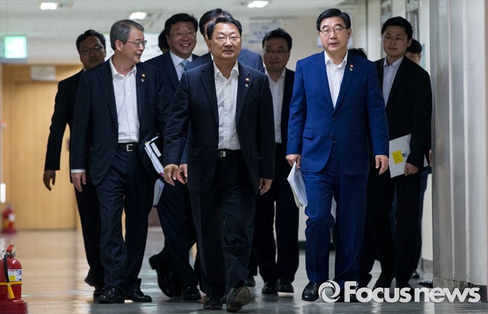 (서울=포커스뉴스) 8일 오전 서울 종로구 정부서울청사에서 유일호 부총리 겸 기획재정부 장관, 이기권 고용노동부 장관, 임종룡 금융위원장, 주형환 산업통상자원부 장관, 김영석 해양수산부 장관이 구조조정 추진현황 및 계획에 대해 발표하기 위해 발걸음을 옮기고 있다.
