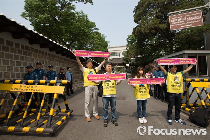 (서울=포커스뉴스) 10일 오전 서울 중구 주한영국대사관 앞에서 가습기살균제 피해 가족과 환경보건시민센터 시민 단체 관계자들이 영국대사와의 면담을 위해 들어가기 전 피켓을 들고 있다.