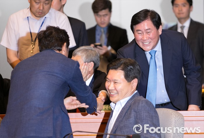 (서울=포커스뉴스) 9일 오후 서울 여의도 국회에서 국회 부의장 후보 선출을 위해 열린 새누리당 의원총회에 참석한 최경환 의원이 동료 의원들과 인사하고 있다.
