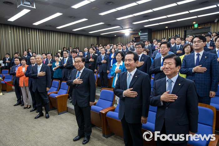 (서울=포커스뉴스) 9일 오전 서울 여의도 국회에서 열린 의원총회에 참석한 국회의장 후보들이 국민의례를 하고 있다. 오른쪽부터 박병석 의원, 정세균 의원, 문희상 의원.