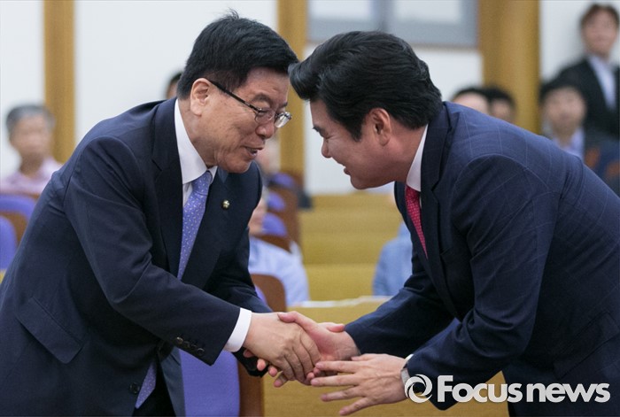 (서울=포커스뉴스) 8일 오전 서울 여의도 국회 의원회관에서 열린 국가미래전략포럼(일명 알파포럼) 창립총회 및 강연회에 참석한 원유철(오른쪽) 새누리당 전 원내대표와 김광림 정책위의장이 인사하고 있다. 이날 정 원내대표와 서 전 최고위원은 국회의장직을 야당에 양보한다는 뜻을 밝혔다.