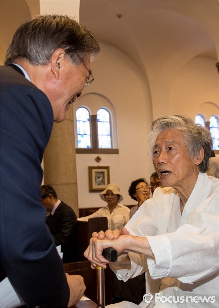 (서울=포커스뉴스) 10일 오전 서울 중구 정동 대한성공회 서울주교좌성당에서 열린 6월항쟁 29주년 기념식에 참석한 문재인(왼쪽) 전 더불어민주당 대표와 백기완 통일문제연구소장이 대화하고 있다.