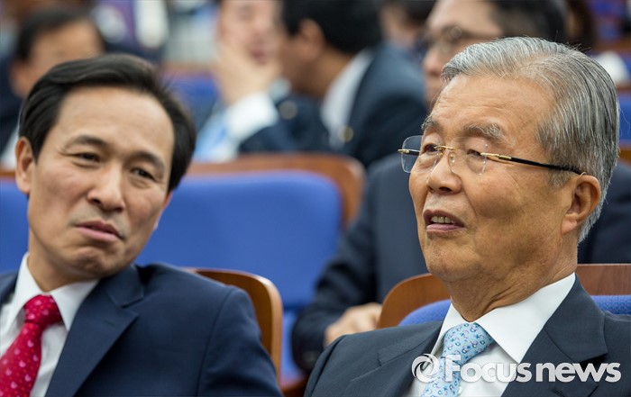 (서울=포커스뉴스) 김종인(오른쪽) 더불어민주당 비상대책위 대표와 우상호 원내대표가 9일 오전 서울 여의도 국회에서 열린 의원총회에 참석해 대화를 나누고 있다.