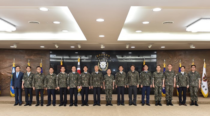 (서울=포커스뉴스) 김종인 더불어민주당 비대위 대표가 8일 오전 서울 용산구 합동참모본부를 방문해 이순진 합참의장 등 관계자들과 기념촬영을 하고 있다. <사진제공=더불어민주당>