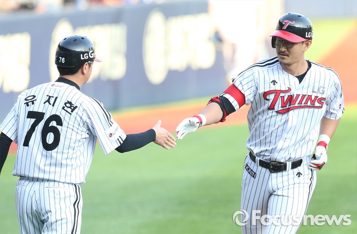 (서울=포커스뉴스) 8일 서울 잠실구장에서 열린 2016 프로야구 삼성-LG 경기 1회말 LG 톱타자 박용택이 우월 홈런을 치고 3루를 돌면서 유지현 코치와 악수하고 있다.