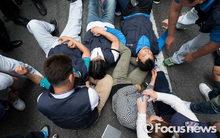 (서울=포커스뉴스) 사내하청 전원 정규직화를 요구하며 고공농성을 벌여온 기아자동차 사내하청 노동자 최정명씨와 한규협씨가 농성을 해제한 8일 오후 서울 중구 옛 국가인권위원회 건물 옥상 광고탑 농성장에서 내려와 병원으로 이동하던 중 경찰과 노조원들이 실랑이를 벌이고 있다.